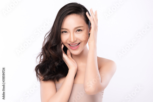 Portrait beautiful young asian woman clean fresh bare skin concept. Asian girl beauty face skincare and health wellness, Facial treatment, Perfect skin, Natural makeup, on white background,two