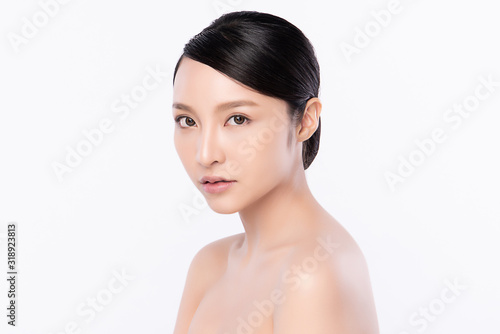 Portrait beautiful young asian woman clean fresh bare skin concept. Asian girl beauty face skincare and health wellness, Facial treatment, Perfect skin, Natural makeup, on white background,two