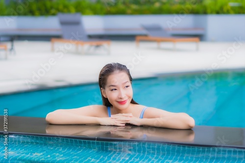 Portrait beautiful young asian woman relax smile leisure around outdoor swimming pool