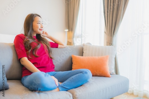 Portrait beautiful young asian woman relax smile on sofa in living area