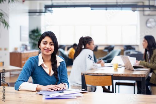 Portrait confident businesswoman working in open plan office