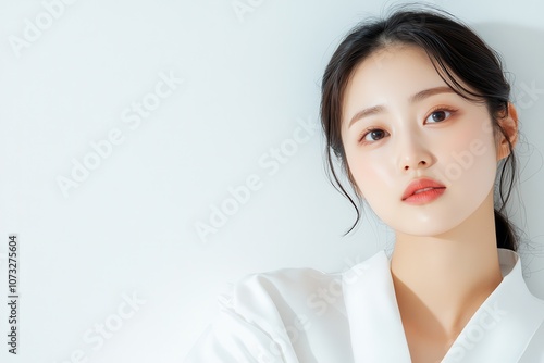 portrait cute asian woman with clean skin, no makeup, skin care concept, minimalism, light background
