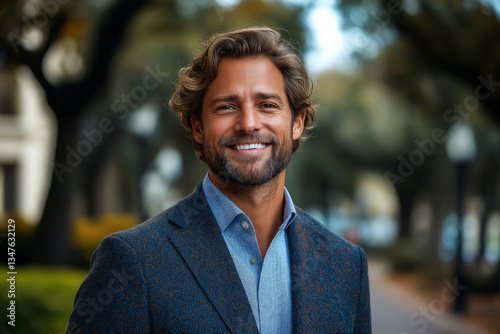 Portrait d'homme entrepreneur souriant et confiant, professionnel et élégant, incarnant le succès et la confiance en soi, idéal pour illustrer le monde des affaires, le leadership et l’entrepreneuriat