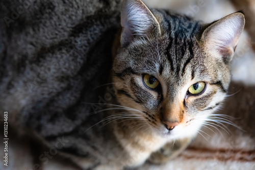 animal, mammal, cat, pet, kitten, pretty, domestic, felino, fur, eye, tabby cat, portrait, face, head, whisker, striped, white, grey, young, green