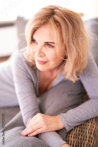 Portrait einer attraktiven älteren Frau zuhause auf der Couch, best ager