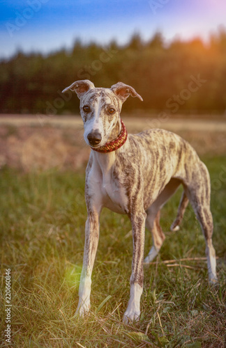 Portrait einer eine Whippet Hündin im Sonnenuntergang