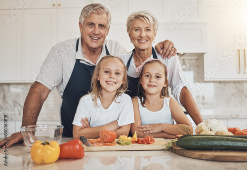 Portrait, family and kids cooking with grandparents in a kitchen with love, care and support at home. Food, face and children learning nutrition, health and preparing meal with happy senior people