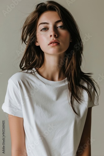 person, fashion, portrait, white, eye, clothing, minimal, light, teenage, woman, t-shirt, adult, cream, photo, sorrowful, elegance, casual attire, studio, human, chic, face, head, isolate, grey, contemplation, multiracial, blouse, style, image, long, shot, soft, folded, individuality, casual clothes, studio shot, body part, medium, young adult, coiffure, long hair, head shot, looking, serious, neck, sleeve