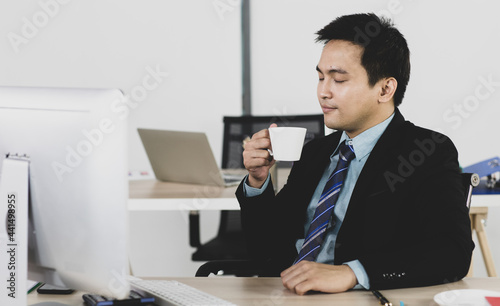 Portrait focus to adult asian businessman are office people very smart and handsome hold coffee cup anก feeling comfortable smile on face. On desk have computer, calculator and tablet