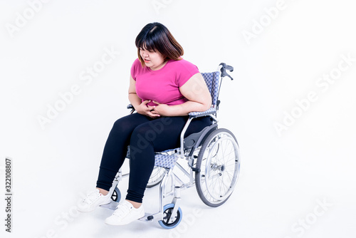 Portrait images, Asian fat woman sitting on a wheelchair have pain in the stomach are from gastritis, On white background to health care concept.