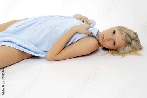 20s, 30s, alone, sanitation, 1, person, people, portrait, woman, woman, towel, spa, only, beautiful, blond, blond, close, up, closeup, eye, contact, female, head, shot, head shot, naked, naked, nudity, on, white, studio, background, young, adult