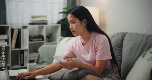 Portrait of Young Asian woman looking at laptop screen holding invoice receipt in hand planning family budget comparing paper and online document,Home finance