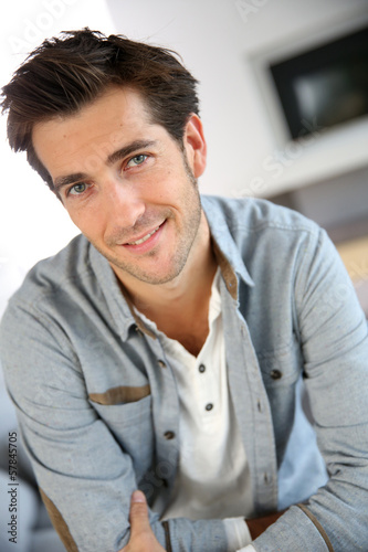 man, male, guy, adult, people, photogenic, portrait, home, relaxed, relaxing, smile, smiling, indoor, interior, modern, european, 30s, casual attire, blue eye, unshaved, unshaved, sitting, single, living room
