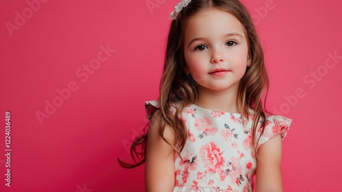 Portrait of 5 to 6-year-old girl with long brown hair wearing floral dress against vibrant pink background exuding innocence and joy ideal for children's photography