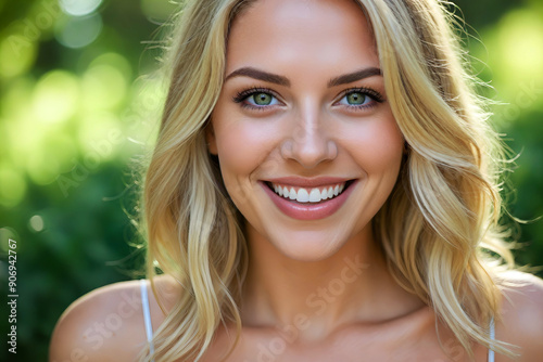 Portrait of a young blonde woman, very smiling, with light green eyes, with lush green vegetation bokeh in the background.