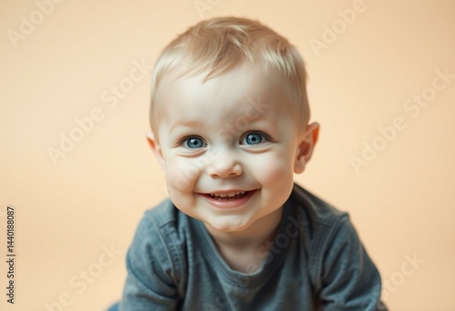 Portrait of a 3-year-old boy with a big smile and bright blue eyes