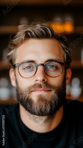 Portrait of a bearded man with glasses. He has light hair and a warm, friendly expression. The background is softly blurred for a cozy, intimate feel.