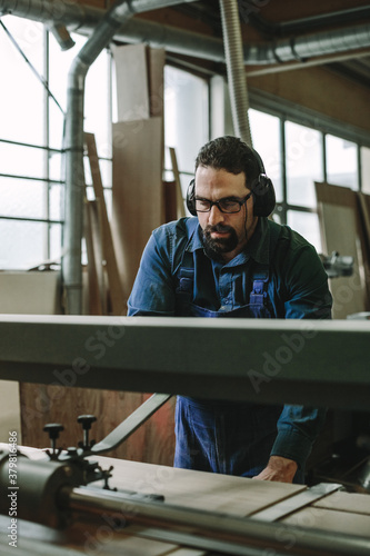 portrait of a bearded woodworker with black protection earmuffs working on a belt sander