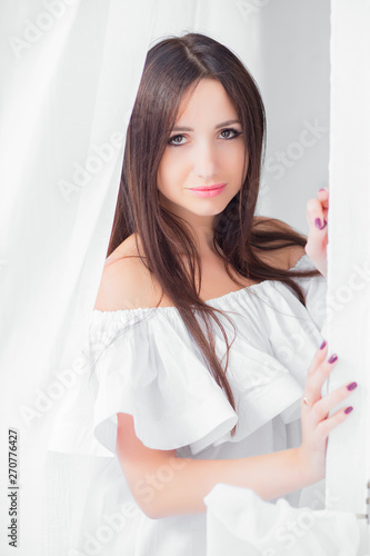 adult, alluring, attractive, beautiful, caucasian, charming, cutie, elegance, elegant, fashion, female, femininity, girl, glamourous, glamour, gorgeous, indoor, lady, lovely, luxury, make-up, model, neat, nice, honed, person, posing, pretty, seductive, sensual, sexy, slim, studio, woman, young, beauty, black, white, portrait, brunette, 1, curtain, hair, hand, finger, look, dress, thoughtful, calm