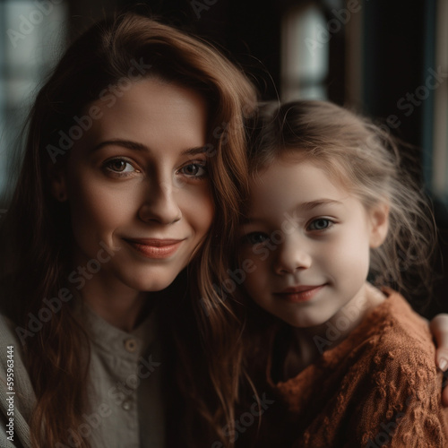 Portrait of a beautiful mother and daughter in the interior of the house, created with Generative AI Technology