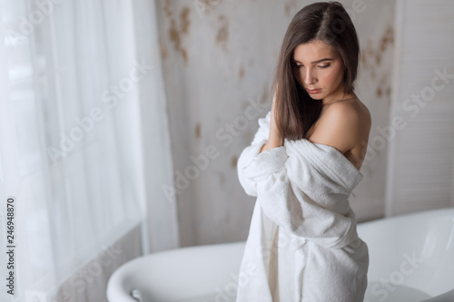 Portrait of a beautiful seductive young brunette lady with bare shoulders, let her bathrobe bare tender frigile body during spa procedure