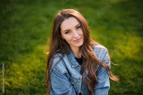 Portrait of a beautiful woman sitting on the green grass in the autumn park