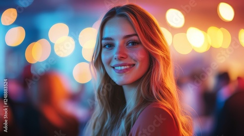 woman, portrait, smile, face, blond, hair, eye, beautiful, girl, pretty, person, background, blurred, bokeh, light, glowing, colourful, female, model, close, up, studio, fashion, style, glamour, attractive, elegant, confident, happy, positive, vibrant, charming, dreamy, youthful, serene, graceful, sophisticated, radiant, festive, cheerful, evening, night, party, event, gathering, celebration, warmth