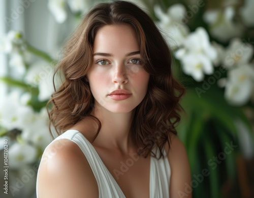 woman, portrait, beauty, floral, flower, brunette, wavy hair, natural, elegance, soft light, feminine, white dress, model, fashion, glamour, delicate, serene, closeup, face, beautiful, attractive, make-up, coiffure, floral background, dreamy, romantic, missy, sophisticated, chic, natural beauty, greenery, graceful, peaceful, modern, stylish, hi-res, fresh, indoor, gentle, aesthetic, confident, flawless