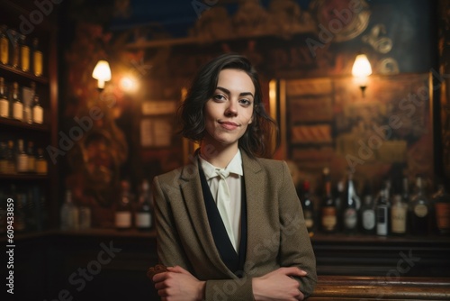 Portrait of a beautiful young brunette woman sitting in a pub.