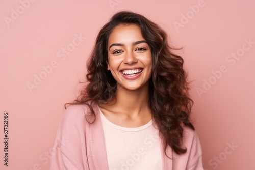 Portrait of a beautiful young woman laughing and looking at camera isolated over pink background
