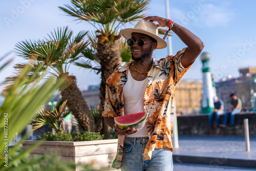 Portrait of a black ethnic man enjoying summer vacation on the beach, wearing a hat and a watermelon smiling
