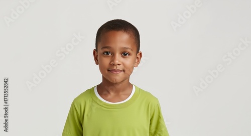 boy, portrait, studio, shot, green, shirt, white, background, children, simple, neutral, lighting, smile, dark, hair, smooth, skin, face, casual attire, soft, cotton, fabric