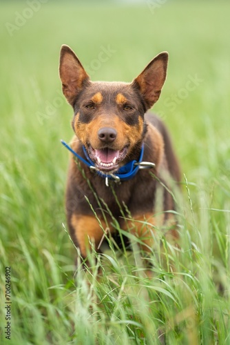 portrait of a brown working kelpie dog sitting in grass on a farm in spring