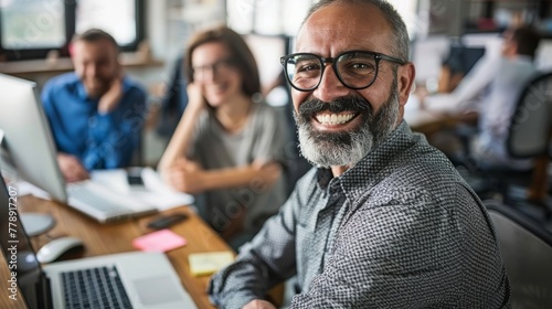 Portrait of a business man sitting in an office with his colleagues in the background. Happy business man working in a co-working office.