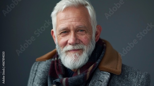 man, caucasian, coat, senior, male, adult, white, businessman, business, person, studio, gesture, 1, single, smiling, retired, mature, trendy, elderly, confident, standing, grey hair, friendly, bearded, cheerful, older, happy, success, casual attire, clothes, grey background, hat, attractive, isolated, executive, model, denim, portrait, middle-aged