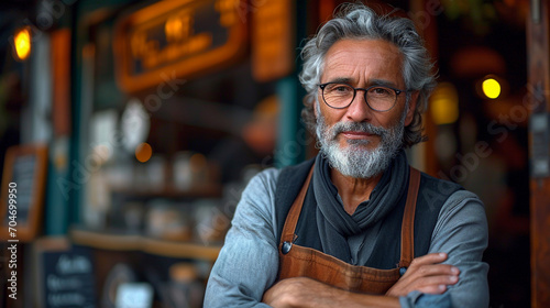 Portrait of a Caucasian cafe owner standing in front of the cafe