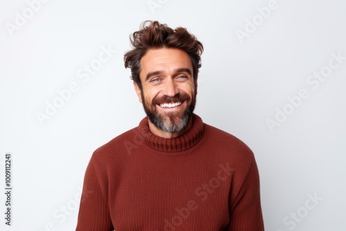 Portrait of a cheerful man in his 30s dressed in a warm wool sweater on white background