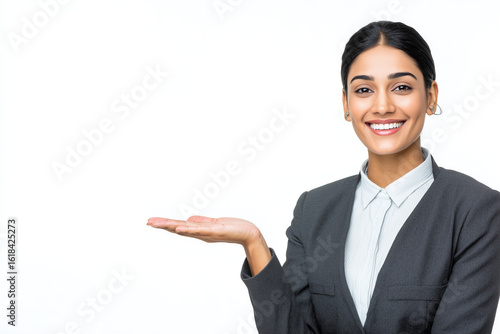 Portrait of a confident and smiling young Indian woman presenting with a cheerful gesture, Present