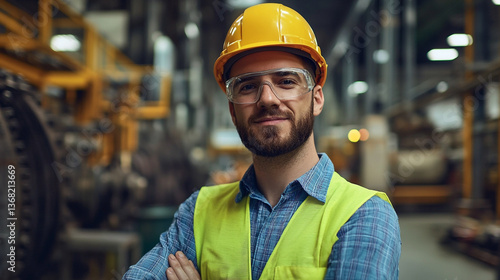men at work, factory, industrial, safety, hard hat, vest, goggles, portrait, man, engineer, construction, professional, manufacturing, equipment, industry, male, adult, job, employee, uniform, protective, gear, work, site, supervisor, manager, skilled, labor, machine, technology, plant, production, facility, warehouse, arms crossed, confidence, smiling, beard, caucasian