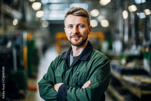 Portrait of a confident Industrial Training Manager overseeing operations on a busy factory floor