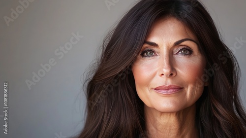 Portrait of a Confident Middle-Aged Woman with Long Dark Hair and Natural Makeup Against a Soft Neutral Background, Emphasizing Grace and Poise in Every Detail
