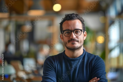 Portrait of a confident young man wearing glasses standing in a cafe.