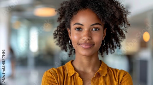 woman, portrait, office, modern, confident, smile, curly, hair, young, professional, environment, business, bright, standing, attire, warm, indoor, fashion, leader, personality, elegance, confidence, success, empowerment, expression, light, setting, identity, poised