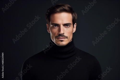 Portrait of a content man in his 30s wearing a classic turtleneck sweater against a minimalist or empty room background. AI Generation