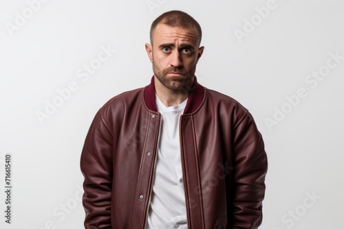 Portrait of a content man in his 40s sporting a stylish varsity jacket against a white background. AI Generation