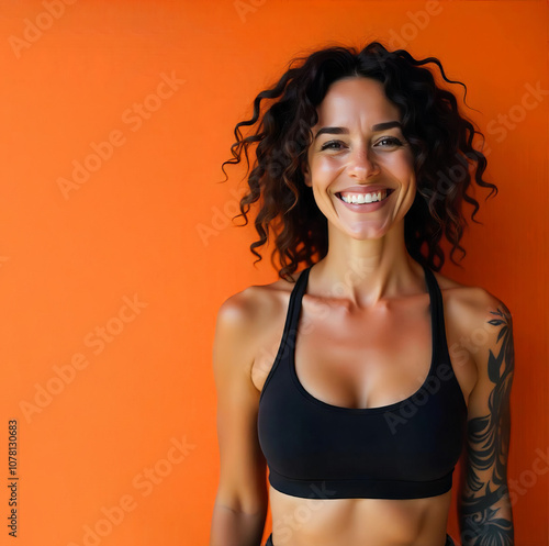 Portrait of a curly girl in a sports top and many tattoos on her arms