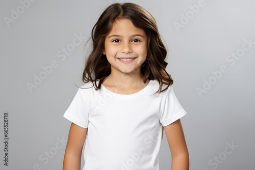 Portrait of a Cute and Innocent Fictional Little Girl Smiling. Joyful Facial Expression, Isolated on a Plain Colored Background. Generative AI.