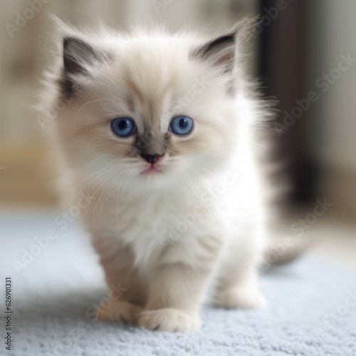 Portrait of a cute blue point Ragdoll kitten looking at the camera. Portrait of an adorable blue Ragdoll kitty with thick fur standing in a light room beside a window. Beautiful small cat at home.