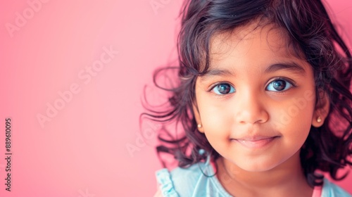 Portrait of a cute indian child, beautiful face with big eyes, pastel color background