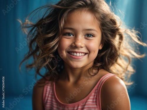 portrait of a cute pretty teen girl with long hair and cute smile in blue background in the studio. Generative AI